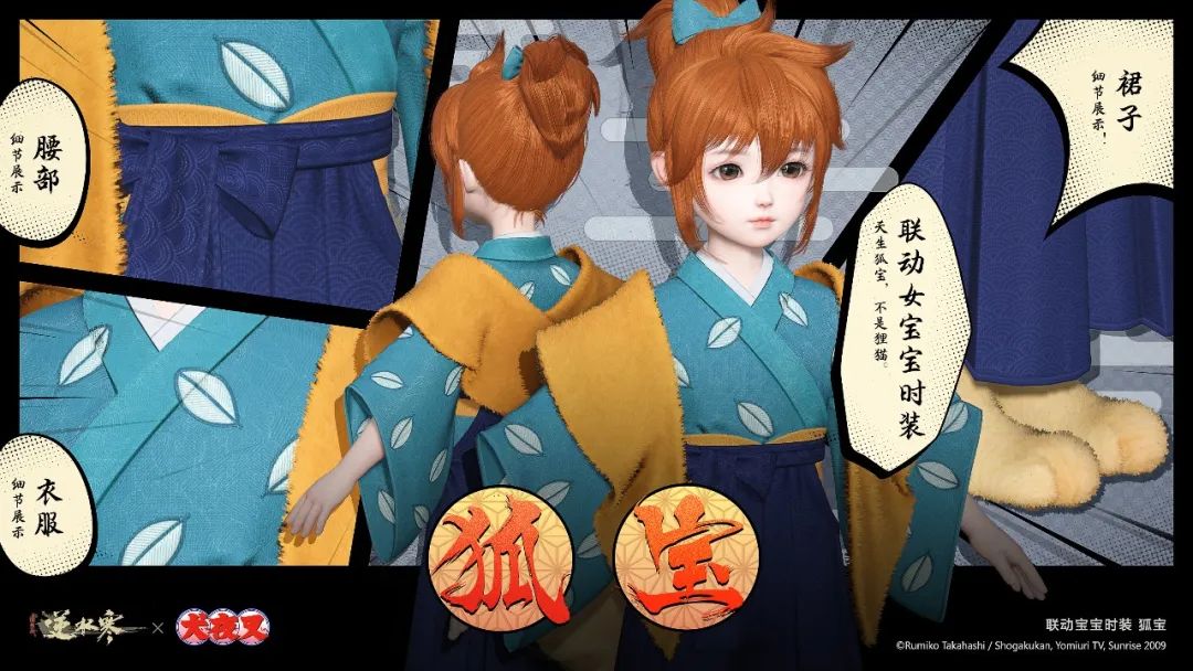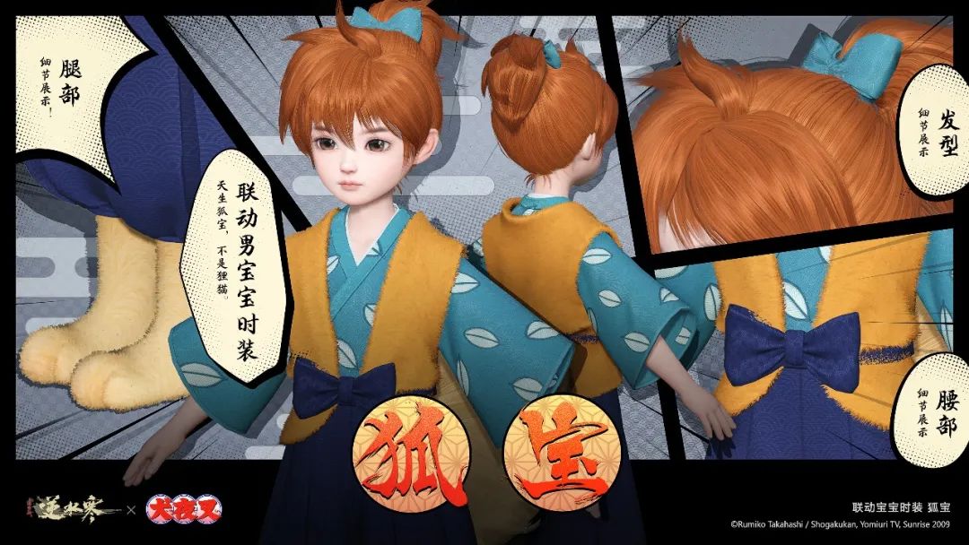 上身為內(nèi)里一件藍(lán)綠襯衣點(diǎn)綴葉片紋樣,外搭一件毛絨絨的橘色外套。男寶寶的下身是一條深藍(lán)色嵌魚鱗暗紋的燈籠褲,女寶寶下身則改良自巫女服的緋袴。