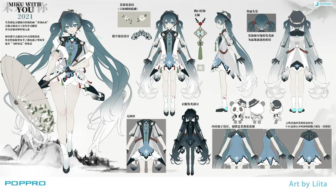 茉莉花是因為(初音未來)V4C最初公開時演唱的曲子就是《茉莉花》。衣服靈感來自于近代中式服裝,并且添加各種傳統(tǒng)元素。圍巾鏤空靈感來自于中式剪紙窗花,外套整體版式參考了濰坊燕子型風(fēng)箏,也有“飛的更遠(yuǎn)”的寓意。