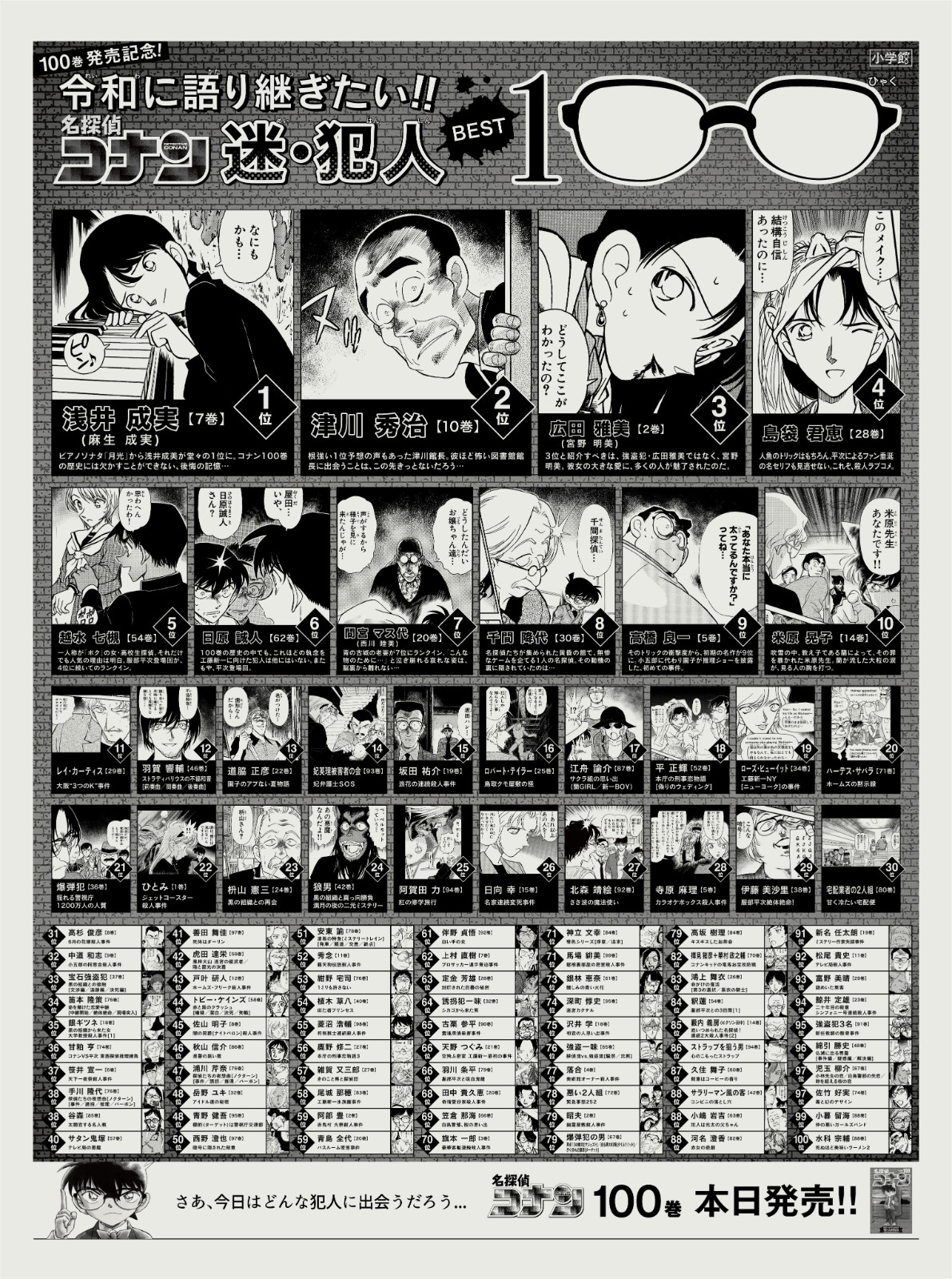 為了慶祝第100卷發(fā)售,特意做了一份號外的報紙! 上面刊載了夏洛克·福爾摩斯的拍攝秘密故事,以及 "名偵探柯南神秘犯人投票"的結(jié)果! 可以從專門的網(wǎng)站上免費下載,大家記得去看!