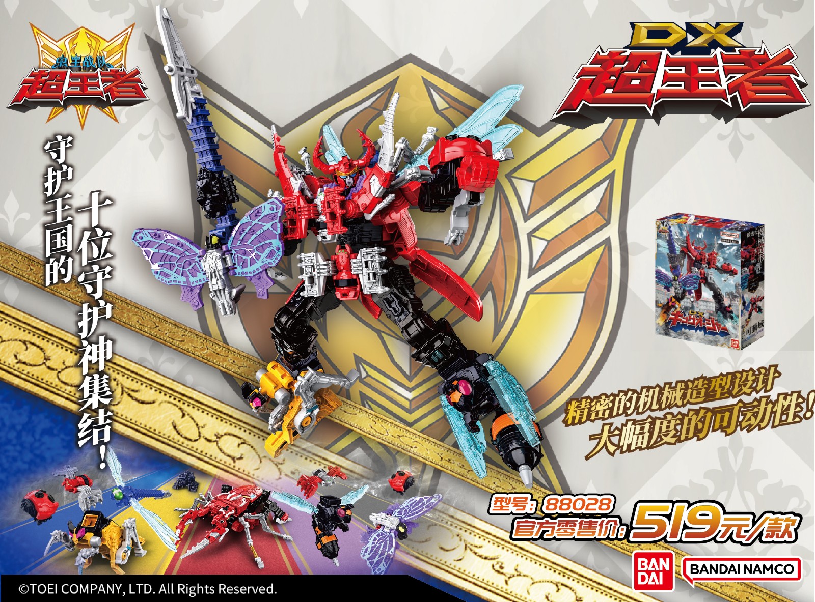 【國內(nèi)商品】萬代《蟲王戰(zhàn)隊(duì)超王者》系列DX超王者隆重登場! 守護(hù)王國的十位守護(hù)神齊聚合體,國王們乘坐的機(jī)器人“超王者”誕生,沖破障礙打敗敵人。快發(fā)揮同伴相助的強(qiáng)勁力量,體驗(yàn)百變的DX超王者合體吧!新品現(xiàn)已在各大百貨商店上線,快把他帶回家吧!*不同店鋪的新品到店時(shí)間及庫存情況不相同,詳情請以各店鋪現(xiàn)場公布的實(shí)際情況為準(zhǔn)。